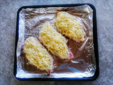 Посыпьте равномерно сверху каждый кусочек натёртым сыром. Форму со свиными отбивными поставьте в предварительно разогретую до 180 гр. духовку на 20 - 25 минут или до румяной корочки.
