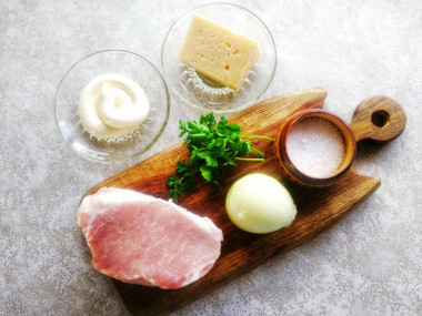 Как сделать свиную отбивную в духовке с сыром? Подготовьте указанные продукты. Свинину лучше брать без костей и прожилок, целым куском. Лук средний, но здесь тоже на любителя - кто любит лук может взять побольше. Сыр я беру полутвёрдый 50 % жирности, он прекрасно расплавляется в духовке, образуя аппетитную корочку. Для сочности используйте майонез. Соль, перец по вкусу. Подготовить посуду для использования в духовом шкафу.