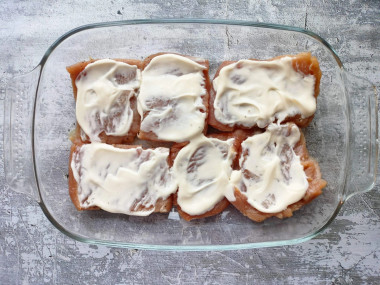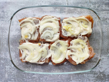 Каждый кусочек посолите и поперчите. Смажьте равномерно майонезом. Майонез даст сочность мясу, лук и сыр не получатся сухими.