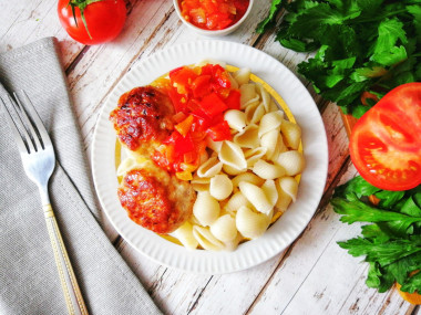 Трудно назвать более сытное и калорийное блюдо, чем свиные котлеты с макаронами, вместе с тем его быстро и несложно готовить. Очень вкусная получилась подлива, хотя я использовала замороженный болгарский перец и томатную пасту вместо свежих помидоров, от себя добавила столовую ложку соевого соуса. В фарш чеснок добавила в меньшем количестве (но это по вкусу). Сливочное масло не добавляла вообще, подлива и без него замечательно обволакивает макароны. Получился вкусный и сытный ужин для голодного мужа Улыбка