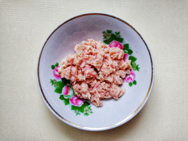 В глубокую миску перекладываем фарш, добавляем размоченный батон и измельченный чеснок, солим и перчим по вкусу.