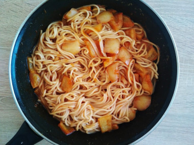 К подливке на сковороду всыпаем макароны и добавляем кусочек сливочного масла. Все хорошо перемешиваем и тушим 3 минуты. Макароны готовы.