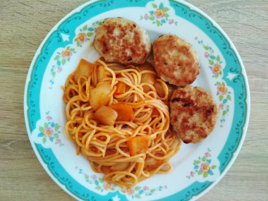 Подавайте к макаронам с котлетами салат из свежих овощей. Вы можете брать вместо макарон из твердых сортов обычные и варить их согласно инструкции, имеющейся на упаковке.