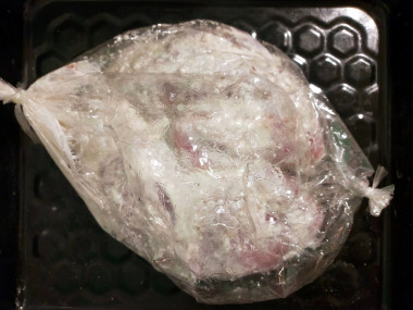 Затем можно индейку вместе с маринадом завернуть в фольгу или рукав для запекания, если нет подходящей формы с крышкой. Я переложила в меньшую форму для микроволновки - она вполне подходит и для запекания в духовке.