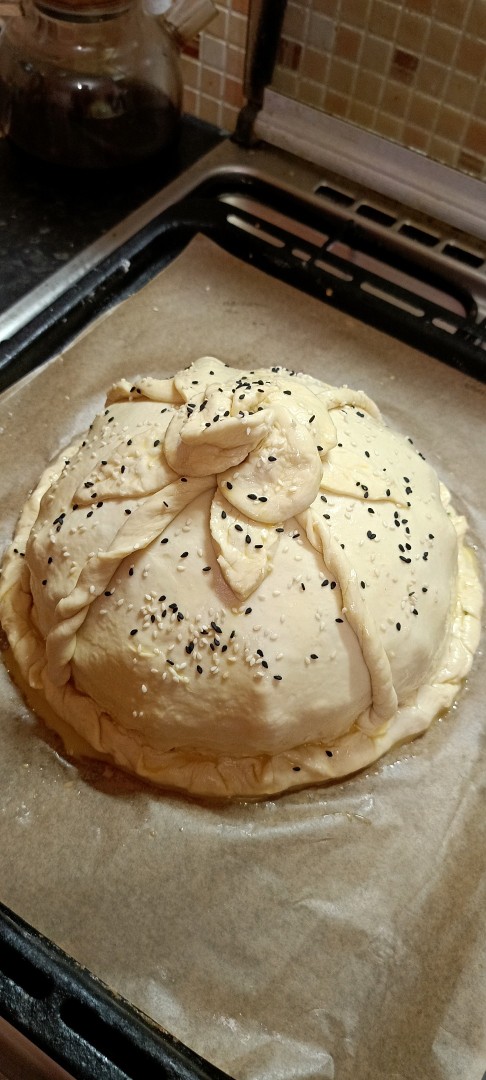Вторую половинку слоеного теста раскатайте так, чтобы хватило закрыть все слои сверху. Накройте тестом пирог. Лишнее срежьте ножом или ножницами. Защипните края. Из остатков теста сделайте разные украшения.