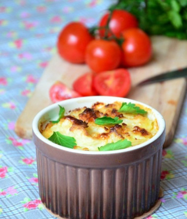 Форму для запекания смажьте сливочным маслом. Выложите бОльшую часть картофельного пюре.