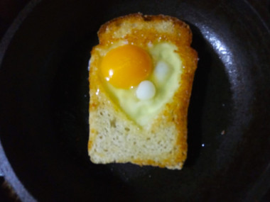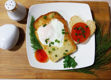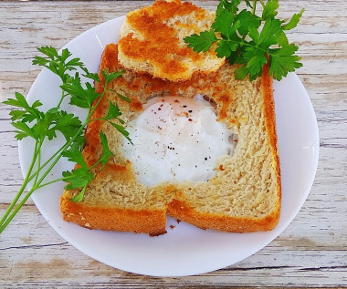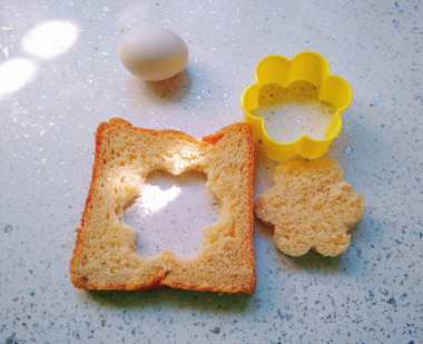В школе на уроках труда мы готовили такой завтрак) Решила сыну перед учебой приготовить. Сразу скажу, ему одной порции оказалось мало, надо бы в следующий раз сразу парочку приготовить) Хлеб взяла домашнего приготовления, он как раз квадратной формы получился. Тоже сделала вырез вырубкой, только в форме цветочка. Жарила на смеси растительного и сливочного масла. Поджаренный хлеб уже вкусен, а с начинкой из яйца тем более. Сверху присыпала свежемолотым перцем. Сыну очень понравилось, а я у него с тарелки "цветочек" съела, уж больно вкусно было. Хлеб с яйцом отлично сочетаются, мой муж даже яичницу жарит с кусочками хлеба. Красивый и вкусный завтрак. Рецепт замечательный!