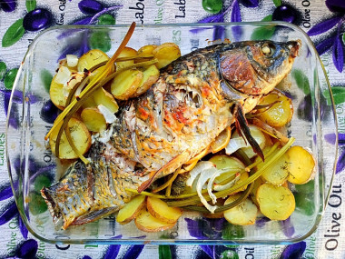 Карп с картошкой в духовке - хорошо известное блюдо, так как готовить его довольно просто. К тому же получаем сразу и основное блюдо, и гарнир к нему - просто и вкусно. Существует немало способов, каждый выбирает тот, который нравится. Карпа можно брать целиком, можно голову удалить. Иногда крупные карпы не входят на противень целиком, да и из голов получается отличная уха, а при запекании голова нужна больше для красоты, я предпочла отрезать хвостик, чтобы он поместился полностью.