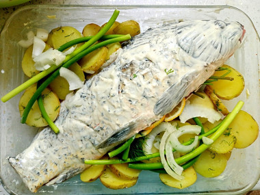 Вот уж действительно была рыбка простая, а стала золотая! Карп с картошкой и лимоном в духовке получился просто сказочным и на вкус и на вид. Мне нравится готовить такие ужины, все сразу в одной форме запекается и сразу же можно подать к столу. Автор рекомендует довести картошку до полуготовности в микроволновке. Я так и сделала. Картошка у меня была молодая, я ее хорошо промыла, обсушила, нарезала шайбочками. Затем присолила и для запаха добавила немного укропа. В микроволновке картошка готовилась 5 минут при мощности 750 Вт. Потом выложила ее в смазанную сливочным маслом форму, а сверху рубку. Рыбу я обмазала не майонезом, а сметаной, смешанной с горчицей. Начинила луком и лимоном, а вместо обычного чеснока добавила чесночный стрелки. Они и ароматизируют хорошо и очень вкусные! Просто шикарное блюдо! Очень вкусная рыбка и гарнир просто отличный!