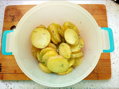 Теперь подготовьте картофель - нужно, чтобы к моменту начала приготовления рыбы он был уже в стадии полуготовности. Поэтому его очистите от кожуры (молодой картофель можете просто хорошо промыть щеткой и кожуру оставить), нарежьте крупными брусочками и сварите до полуготовности - я это сделала в микроволновке. Присолите и полейте подсолнечным маслом, хорошо перемешайте. Пока будет вариться картошка, займитесь карпом.