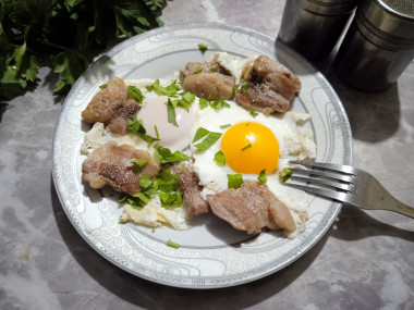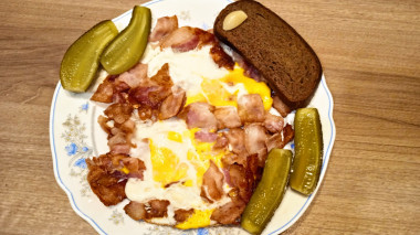 Сегодня готовила настоящий мужской завтрак для мужа. Все делала, как он любит. На сухую сковороду выложила много бекона, растопила его. Разбила два яйца. Муж любит, чтобы желток был хорошо прожарен. Получился очень сытный завтрак. До обеда запас энергии точно обеспечен. Подавала с черным хлебом и домашними маринованными огурчиками.