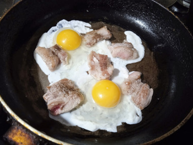 Бекон отодвиньте к краям сковородки и к каждому кусочку аккуратно разбейте по яйцу, не повреждая целостности желтка. Добавьте соль, перец по вкусу. Здесь можно поиграть со вкусами, добавляя различный перец или вкусную соль.