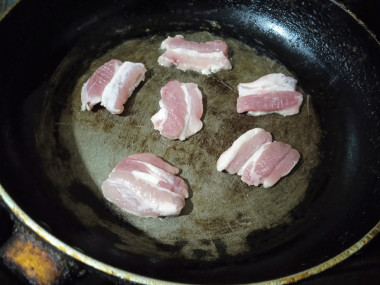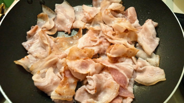 Сковородку разогрейте на огне. Масло здесь не используется, так как бекон сам по себе достаточно жирный. На разогретую сковороду выложите сырые кусочки бекона. Спустя 20-30 секунд его можно будет перевернуть. Чтобы бекон был "позажаристее" нагрев делайте сильным, для менее выраженной корочки, жарить бекон следует на среднем огне.