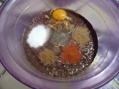 В получившийся фарш добавьте яйцо, соль и перец. Все тщательно перемешайте. Помимо указанных специй можете добавить свои по вкусу.