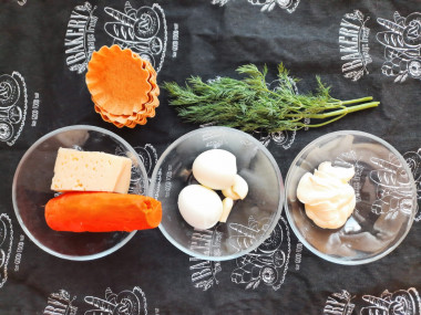 Как сделать закуску из моркови и сыра в тарталетках? Подготовить ингредиенты. Для приготовления тарталеток с морковью и сыром нам понадобится: 6-8 тарталеток. Для начинки: крупные яйца, морковь, кусочек сыра, чеснок и майонез.