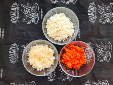 Морковь отварить в кожуре. Охладить, очистить и натереть на средней терке.