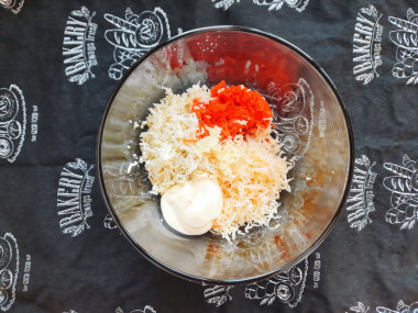 В салатнике соединить морковь, яйца, сыр и чеснок.