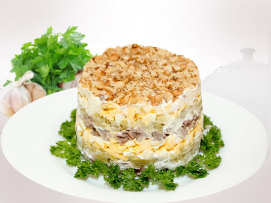 Слегка утрамбуйте салат и аккуратно снимите сервировочное кольцо. Украсьте верх половинками грецкого ореха. Уберите в холодильник на пару часов для пропитки. Затем подавайте к столу. Приятного аппетита!
