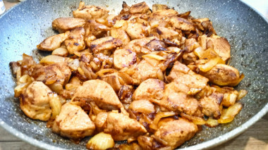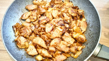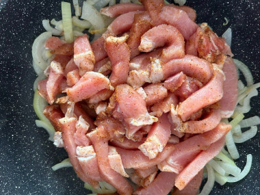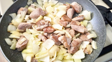 Отправляем на сковороду к репчатому луку приготовленную свинину.