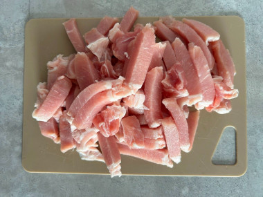 Как пожарить мясо свинины с луком? Подготовьте ингредиенты. Можно использовать любое мясо: свинину, говядину или мясо птицы. Единственное, нужно учитывать, что время жарки у каждого мяса разная. Самое вкусное и сочное мясо, жареное на сковороде, получается из свинины. Главное, использовать свежий и качественный продукт. Свинину моем, срезаем пленки, нарезаем мякоть маленькими кусочками и еще раз промываем водой и просушиваем бумажным полотенцем.