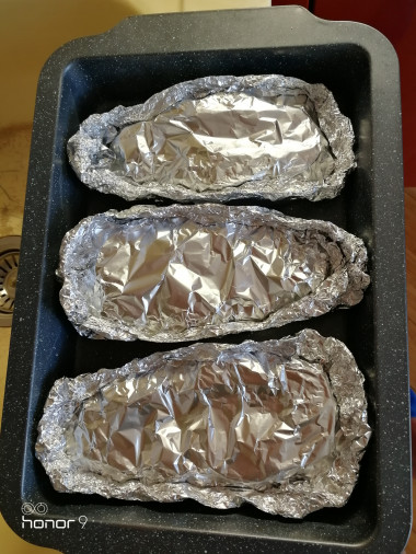 1. Аккуратно, чтобы не порвать, сделать из листа фольги лодочки практически впритык к стекам, максимум оставив 5 мм растояния между краем стейка и фольгой. Таким же образом сделать крышечки, края которых будут входить внутрь лодочек, а не снаружи. Впрочем, можно край лодочки и крышечки защипнуть - таким образом стйки получатся более влажными.