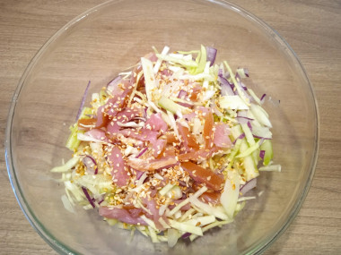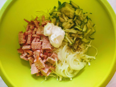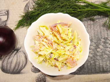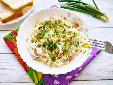 Люблю этот салат за быстроту и простоту в приготовлении. Сегодня не было колбасы, зато был сырокопченый свиной балык. Раньше всегда готовила такой салат без лука, а тут увидела рецепт на любимом сайте и вдохновилась. Нам очень понравилось, особенно мужу, любителю лука, которому в качестве бонуса досталась вторая половинка луковицы, не вошедшая в салат. Свежесть капусты и огурца прекрасно нивелируют тяжеловатые копчености. Заправку тоже можно сделать немного полегче, но это будет уже другой рецепт. От себя добавила немного кунжута.