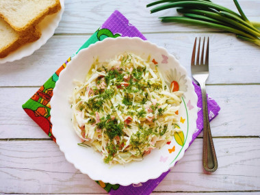 . Капусту брала белокочанную, но думаю с пекинской тоже было бы вкусно. Колбаску нарезала некрупной соломкой. Добавила черный молотый перец, мы любим острее. Подавала посыпав сверху зеленью укропа. Салат получился очень пикантным за счёт подкопчённой колбаски, свежим и хрустящим. Ингредиенты хорошо сочетаются между собой. Было вкусно!
