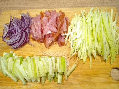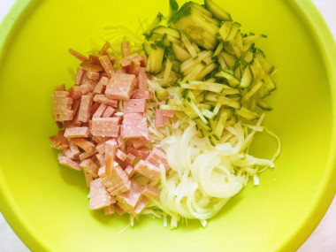Для салата здесь беру обычный репчатый лук, но можно взять салатный красный или свежий зелёный. Лук очистите от шелухи и тонко нашинкуйте полукольцами. Сложите в миску к ранее подготовленным ингредиентам.