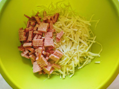 Колбасу извлеките из упаковки, очистите от кожуры. Нарежьте произвольно: соломкой, полукружками или кружками. Положите в салатник к капусте. Я взяла вот такую колбасу, маленькую. Но можно брать любую. Салат с капустой, свежим огурцом и колбасой я делала не раз и он отлично гармонирует с любой подкопченной колбасой, ветчиной, а при желании можете даже взять вареную колбасу.