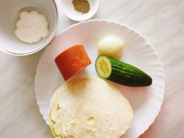 Капусту помойте, освободите от верхних листьев и разрежьте на четыре части. Одна четвертая кочана (1-1.5 кг) как раз по весу подходит для салата. Капусту мелко нашинкуйте, положите в подготовленный салатник, посолите и разомните руками, чтобы она пустила сок. Сложите в удобный, глубокий салатник.