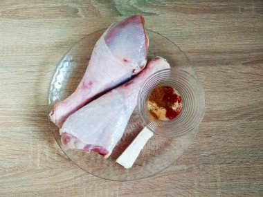 Как запечь голень индейки в фольге? Подготовьте необходимые ингредиенты. Размер и вес голеней зависит от возраста птицы. У меня была одна голень весом чуть больше 1 кг. Но можно заменить ее на две весом по 500 г. Не принципиально. Вместо отдельных специй, можете взять готовую смесь специй для индейки (или курицы на крайний случай). Но учтите, что в готовой смеси уже есть соль и перец, поэтому дополнительно солить/перчить мясо нужно с осторожностью.