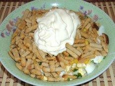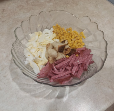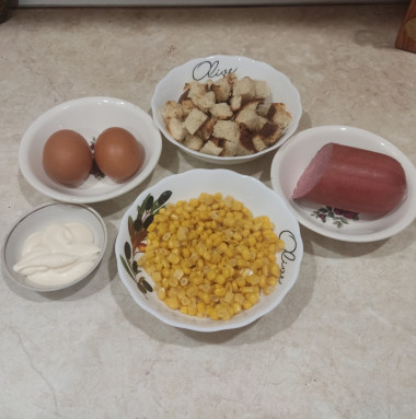 Соединила колбасу, яйца, кукурузу, сухарики,заправила майонезом и перемешала.