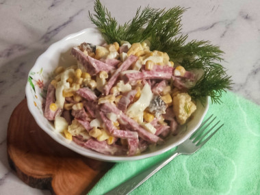 К приходу подруги приготовила салат с кукурузой, колбасой и яйцом за пять минут, хорошо, что яйца вареные были. Люблю такие салатики, без заморочек и вкусные, спасибо!