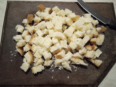 Нарежьте батон на ломтики толщиной не более 1,5 сантиметров, каждый из которых разрежьте на маленькие кубики.