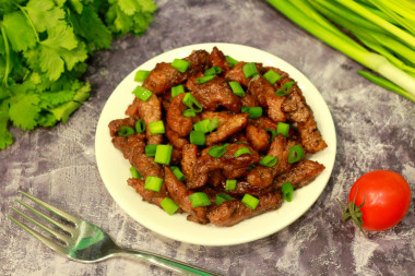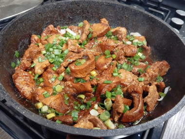 Мясо свинина в соевом соусе на сковороде это очень вкусно!!! Единственное, у меня не было зеленого лука, я его не купила, поскольку лук не был указан в ингредиентах, поэтому готовила без него, с ним, наверно, получилось бы еще вкуснее. Вместо рафинированного масла я использовала кунжутное. Вместе с соевым соусом я еще решила добавить пару зубчиков измельченного чеснока. В общем, дикий восторг, не ожидала, что так вкусно получится. Однозначно, это блюдо еще буду готовить ни один раз.