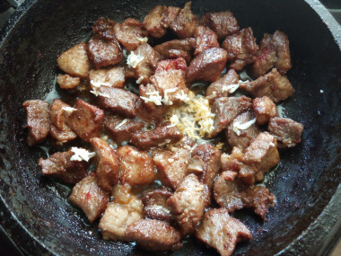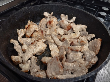 В сковороде на огне чуть выше среднего разогрейте растительное масло. Помешивая, жарьте мясо около 10 минут до румяной корочки.