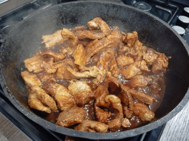 Влейте в сковороду соевый соус. Тушите свинину, помешивая, еще 5 минут на среднем огне. Свинина должна хорошо пропитаться соусом со всех сторон. Вместо обычного соевого соуса можете добавить полусладкий соус терияки. Тогда мясо получится с легким сладким привкусом.