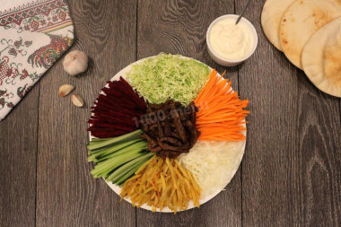 Теперь соберите салат. Все составляющие выложите горкой. Возьмите большое блюдо, в середину выложите мясо, вокруг мяса по кругу выложите овощи: свеклу, капусту, морковь и картошку, последовательность повторяем и следим за тем, чтобы свекла была напротив свеклы морковь - напротив морковки и т. д. Между секций посыпьте зеленью. Лук выложите поверх овощей вокруг мяса. Сверху посыпьте салат солью и смесью перцев.