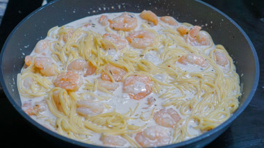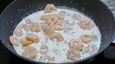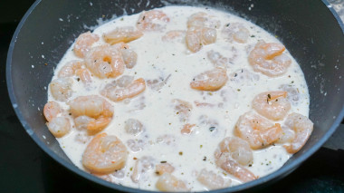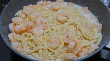 В моей семье любимым и универсальным блюдом является паста. Сегодня на обед я решила приготовить спагетти с креветками в сливочном соусе. Креветки использовала уже очищенные, замороженные. Первым делом отварила спагетти. Тем временем, обжарила на сковороде чесночок, и добавила креветки, чтобы их разморозить. К обжаренным креветкам добавила специи (соль, перец и прованские травы), влила сливки. Немного протомила креветки в соусе и добавила в сковороду спагетти, накрыла крышкой и оставила на 5 минут, чтобы спагетти напитались соусом и чесночно-креветочным ароматом.