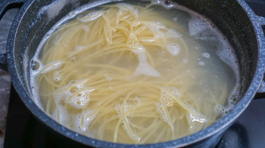 Тем временем вода закипит, закиньте в нее спагетти, посолите. Пусть варятся.