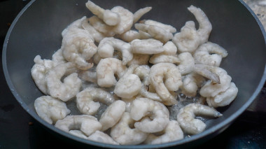 Обжарьте их, постоянно помешивая. Если у вас уже вареные креветки, то жарьте совсем немного по времени, просто чтобы прогреть их. Я жарила пять минут. Дольше не надо, они могут стать резиновыми.