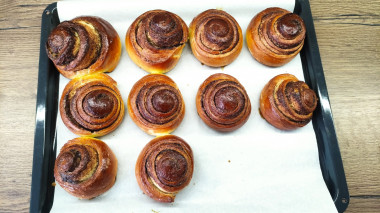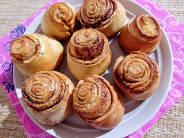 Готовые булочки можно украсить орехами, полить их растопленным шоколадом или смазать кремом из сливочного сыра - тогда получатся известные всем синабонны.
