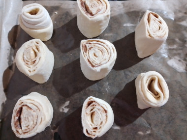 Скрутила пласт теста с начинкой и нарезала. Вот только нож был недостаточно острый и некоторые кусочки сдавил. Хорошо, что на вкус это не повлияло)