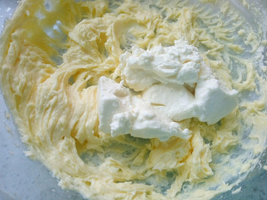 Затем добавьте к маслу сливочный творожный сыр. Взбивайте все вместе еще пару минут. Лучше всего, чтобы сыр был комнатной температуры, тогда он лучше вмешается в крем и масса будет гладкой и равномерной.