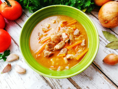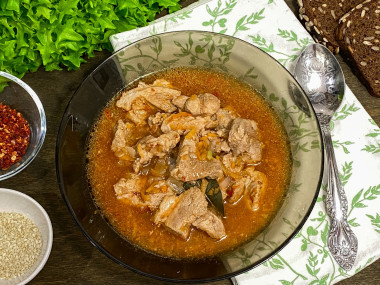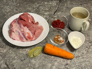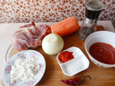 Калорийность продуктов: Свинина, Лук репчатый, Морковь, Пшеничная мука, Томатная паста, Соль, Вода, Смесь перцев молотых, Паприка, Перец острый стручковый, Лавровый лист