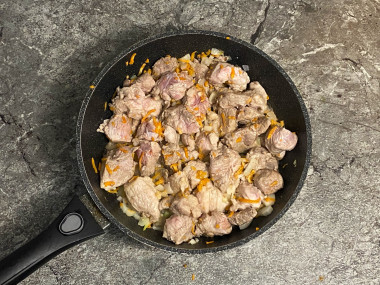 Добавьте нарезанный репчатый лук и пряности (не солите). Быстро перемешайте и дайте луку слегка потомиться с мясом.