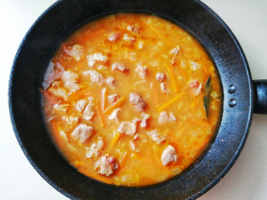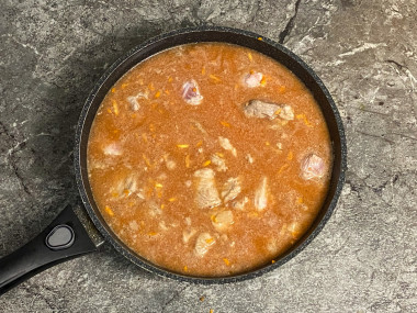 Залейте содержимое сковороды горячей или кипящей водой. Холодная сделает мясо жёстким, и его придется готовить дольше.