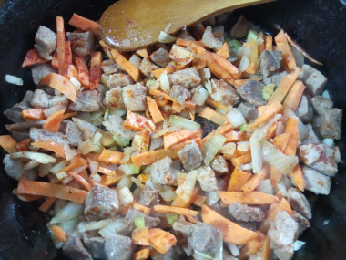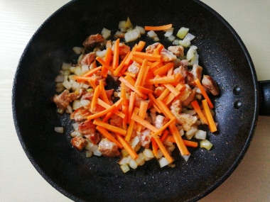 Выложите на сковороду порезанную морковь. Все хорошо перемешайте и тушите до полуготовности овощей.