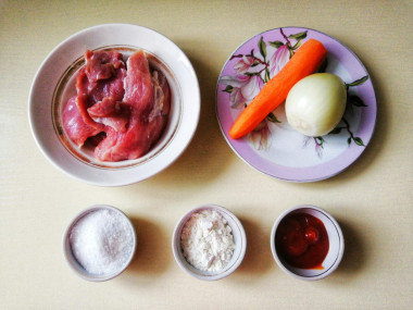 Как сделать вкусный гуляш из свинины на сковороде с подливкой? Подготовьте необходимые ингредиенты. Мясо лучше выбирайте не жирное. Морковь при желании можно не использовать.