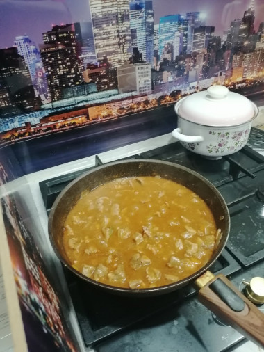 Приготовила гуляш из свинины на сковороде с подливкой. Готовила по рецепту, от себя добавила стебель сельдерея, нравится его аромат)) Гуляш получился очень вкусный, подливка в меру густая, ароматная. Спасибо за рецепт, naniki!